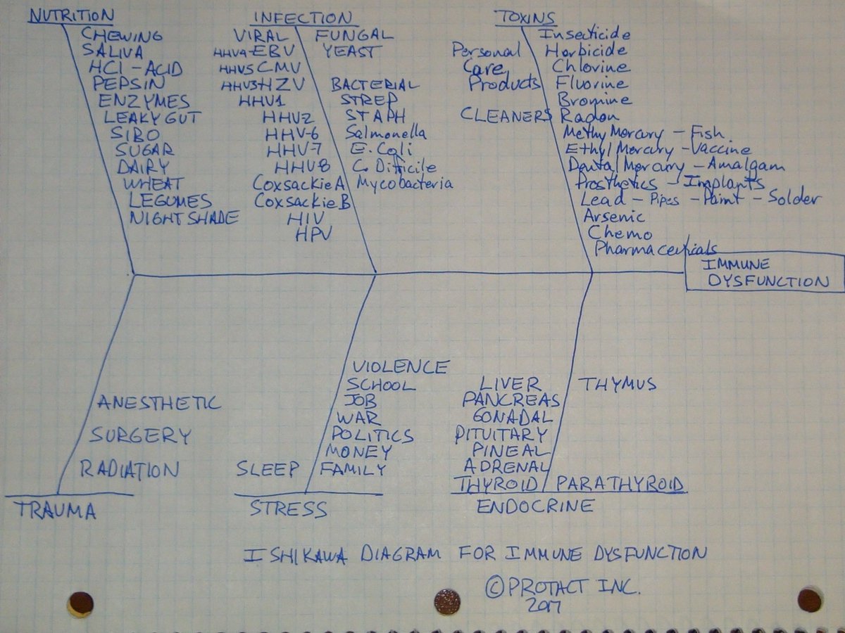 When trying to solve a problem, drawing a cause-effect fishbone diagram can sometimes help. Here's one for immune dysfunction.